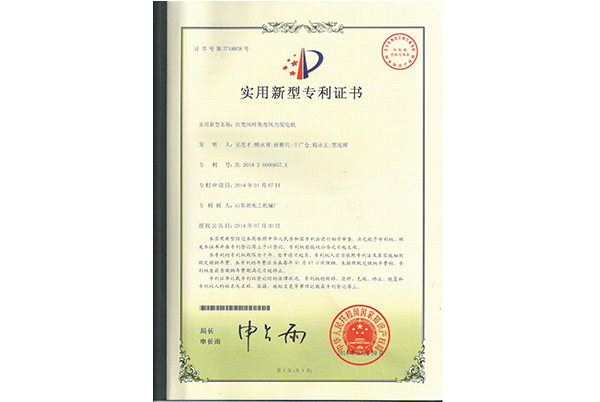 實用新型專利證書—自變風葉角度風力發電機