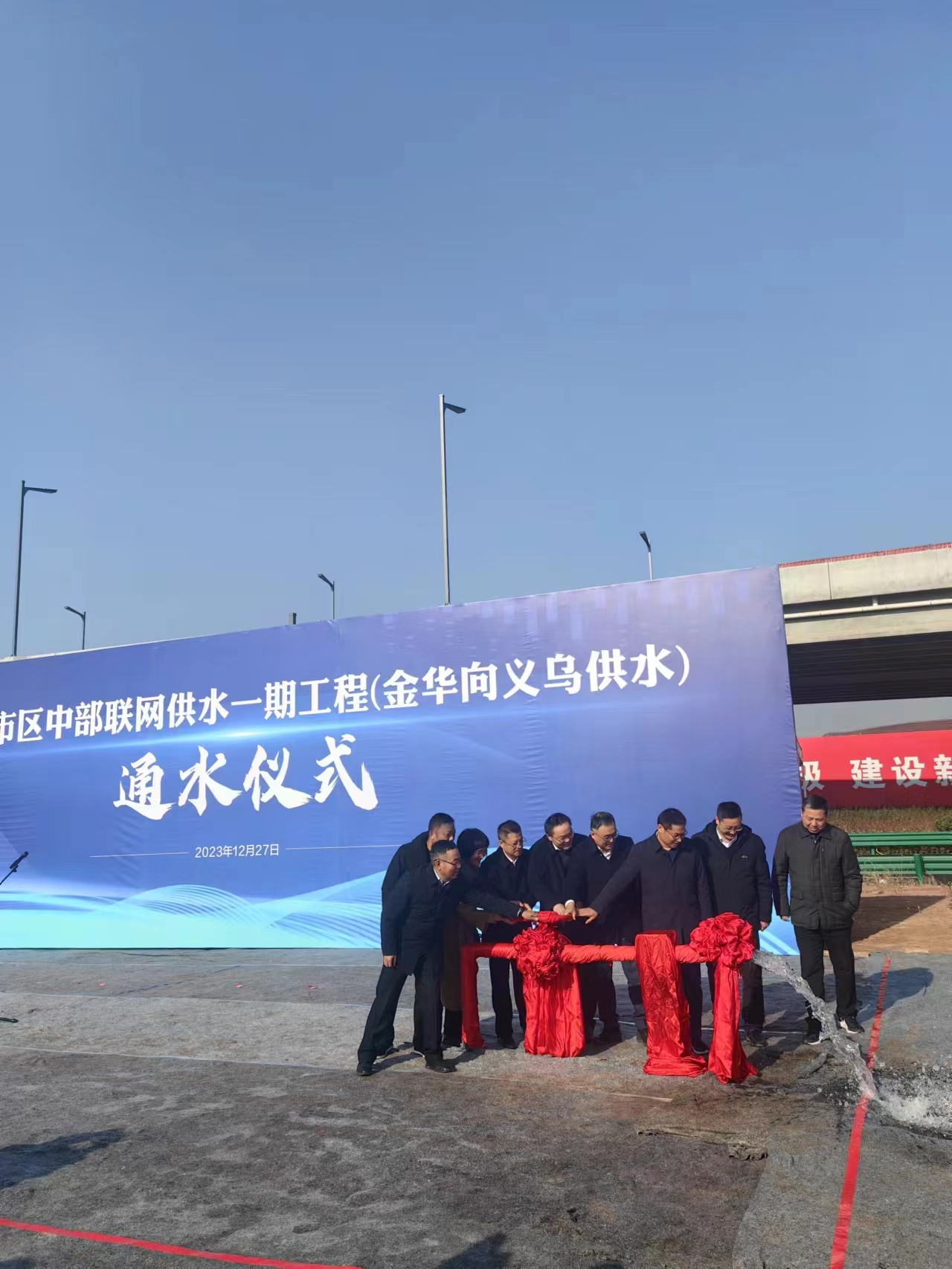 12月27日上午,在金義都市區(qū)中部聯(lián)網(wǎng)一期工程中央大道與華東街交叉處,隨著一股清泉從供水管道口噴涌而出,由第六分公司承建的金華—義烏供水工程實(shí)現(xiàn)正式通水。金華市政府、金華市城投集團(tuán)等相關(guān)單位共同見證了該通水儀式。