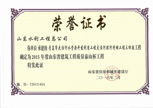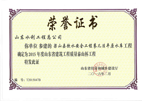 公司"梁山縣飲水安全工程蓼二洼平原水庫(kù)工程“等兩項(xiàng)工程榮獲2015年度山東省建筑工程質(zhì)量泰山杯