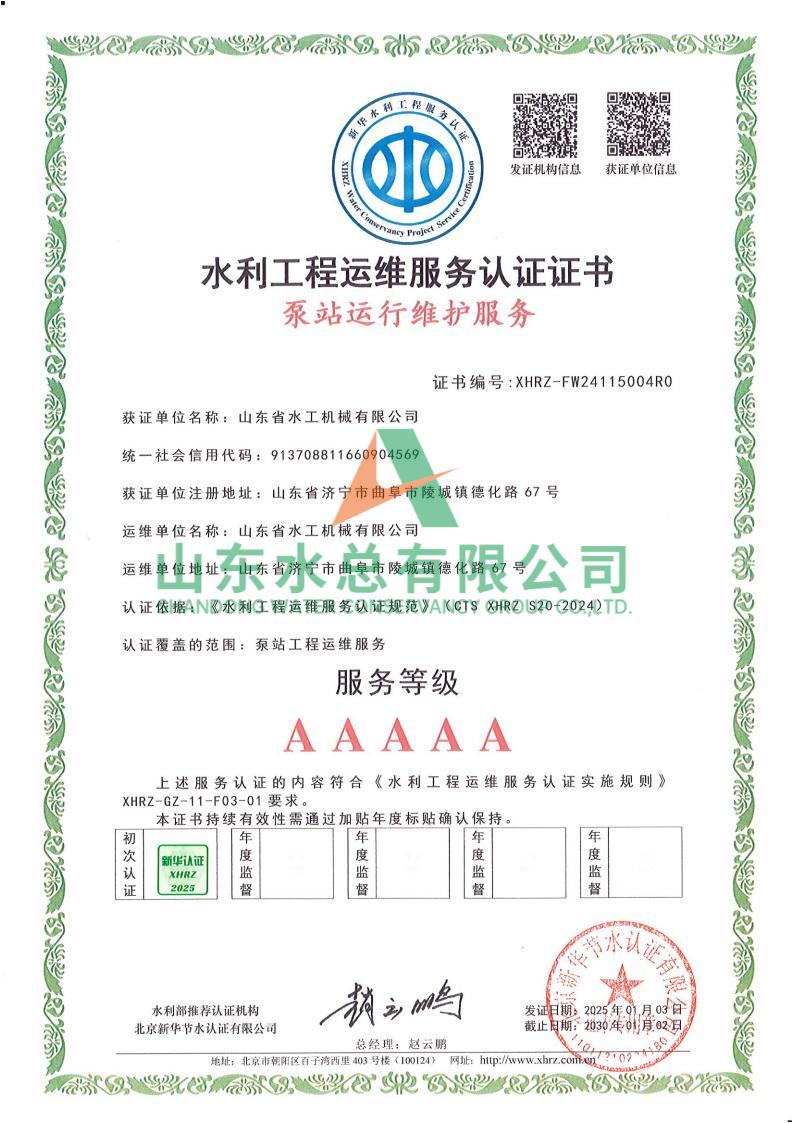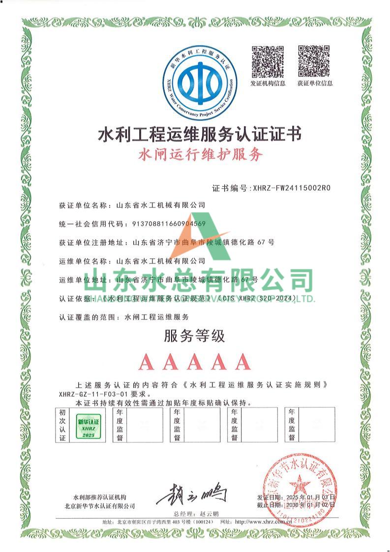 一直以來,水工機械公司高度重視水利工程運維服務的質量與專業性,在人員配備、技術應用、管理體系等多方面精心打磨。在認證過程中,歷經嚴格審核,公司憑借扎實的運維實力、規范的服務流程以及對水利工程運維高規格的執行標準,贏得了認可。