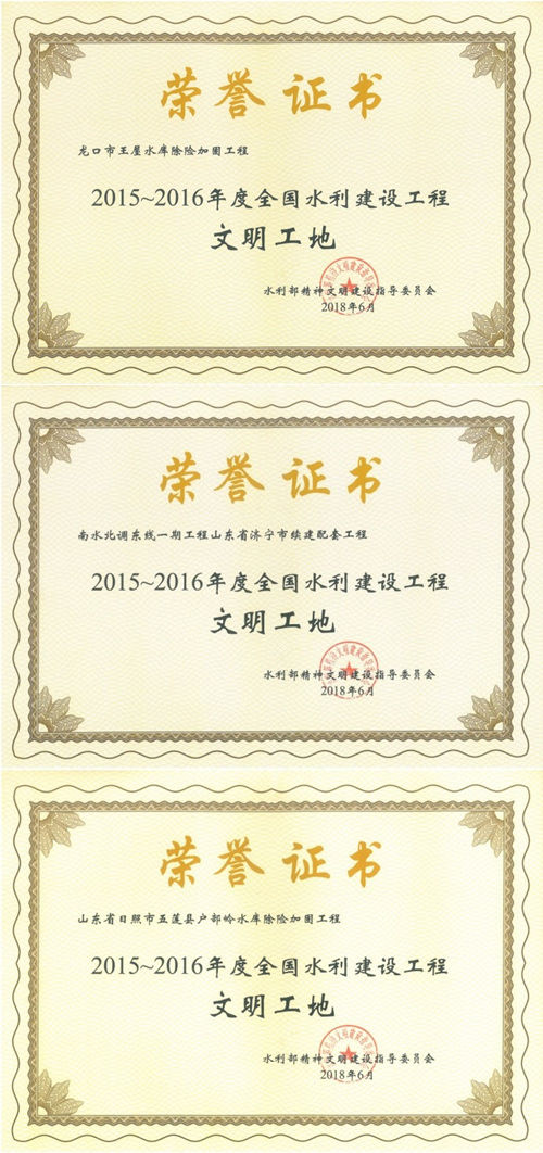 公司“龍口市王屋水庫(kù)除險(xiǎn)加固工程”等項(xiàng)目榮獲“2015-2016年度全國(guó)水利建設(shè)工程文明工地”稱(chēng)號(hào)