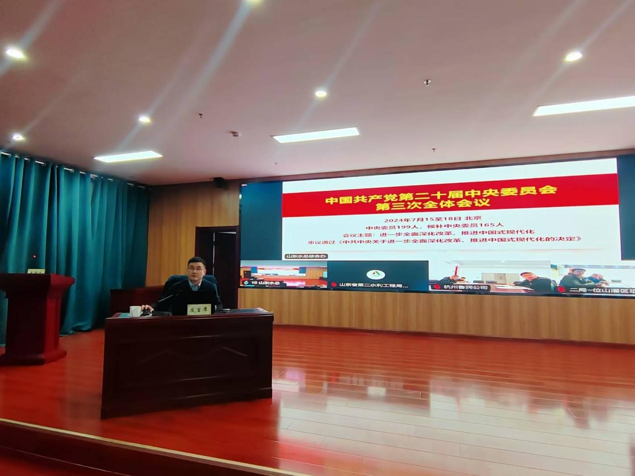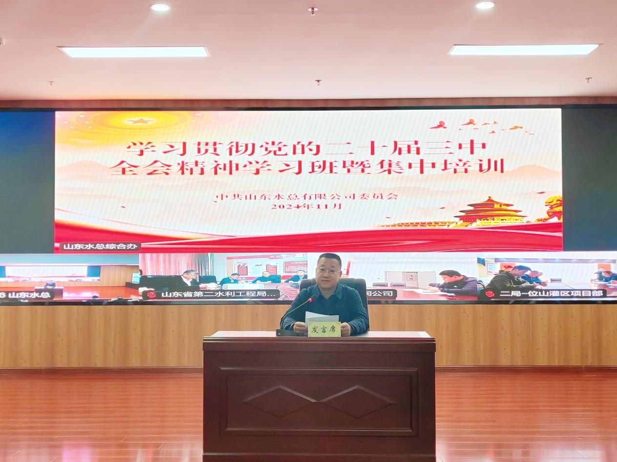 為深入學習貫徹落實黨的二十屆三中全會精神,按照山東高速集團黨委統一部署,11月18日,山東水總公司黨委組織舉辦了黨的二十屆三中全會精神學習班暨集中培訓,教育引導廣大黨員干部深入領會黨的二十屆三中全會的重大意義和豐富內涵,切實把學習成效轉化為工作實效,推動習近平總書記重要指示要求、全會各項部署及上級黨委工作安排在公司落實落地。本次專題學習班為期三天,采取輔導報告講座、分組集中學習、交流研討等相結合方式。
